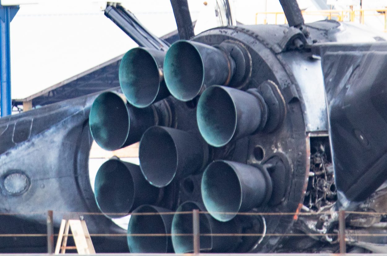 Die Triebwerkssektion der Rakete ging nicht mit über Bord – der Booster brach oberhalb davon an der Bordkante ab. Möglicherweise können diese Motoren – es sind die teuersten Elemente des Trägers – gerettet werden.