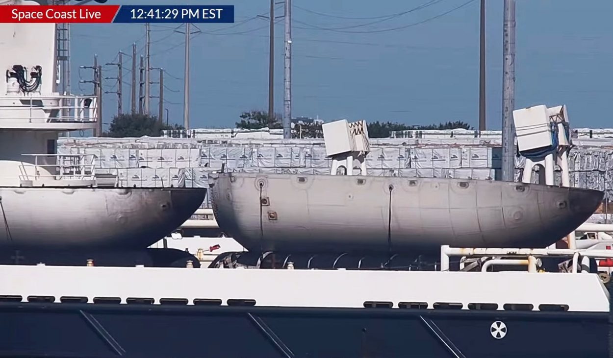 Die beiden Hälften der Nutzlastverkleidung werden in Port Canaveral angelandet. Quelle: SpaceX.