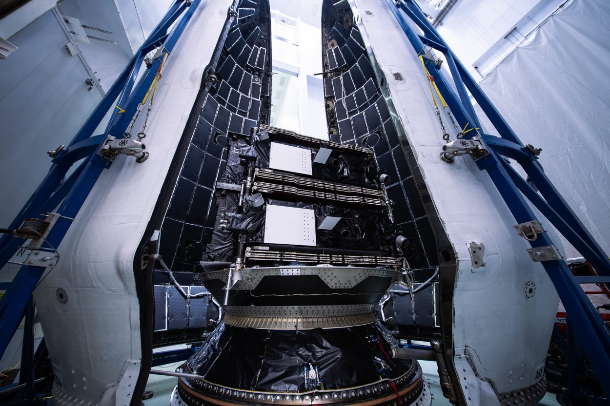 Die beiden Satelliten aufeinandergestapelt unter der Nutzlastverkleidung. Quelle: SpaceX.
