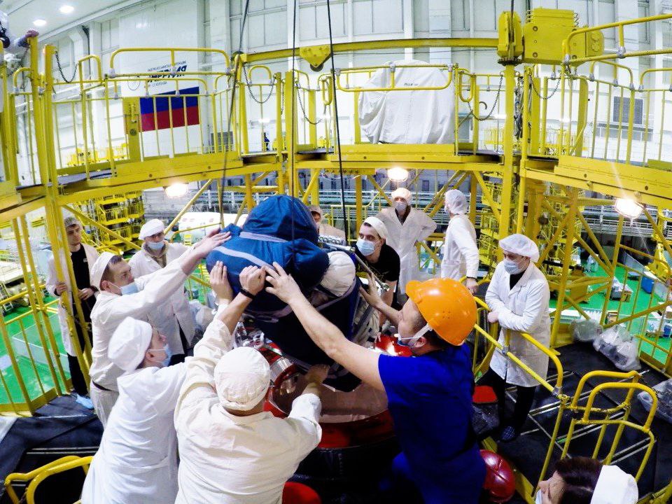 Der Orlan-Raumanzug wird in der Progress verstaut. Quelle: Roskosmos.